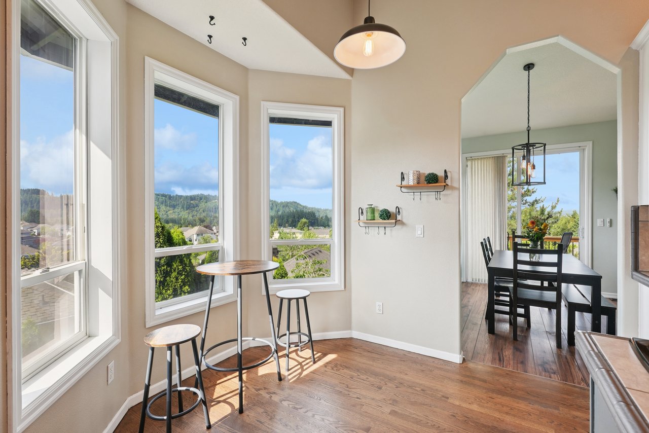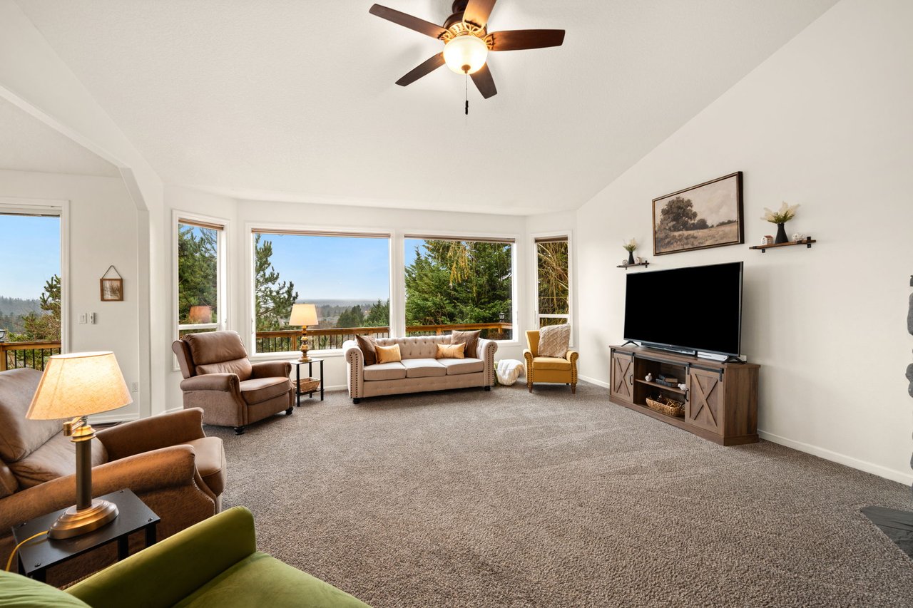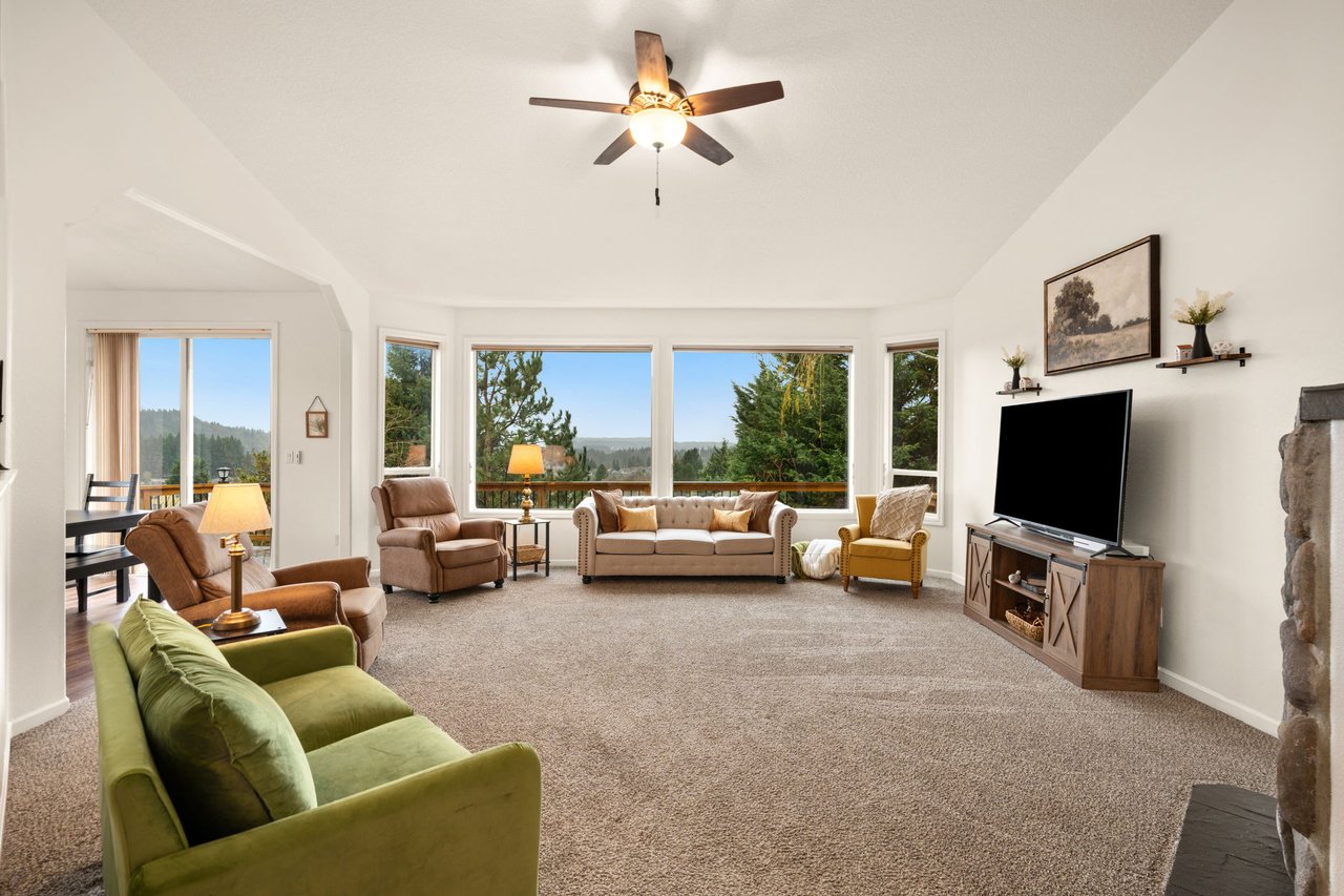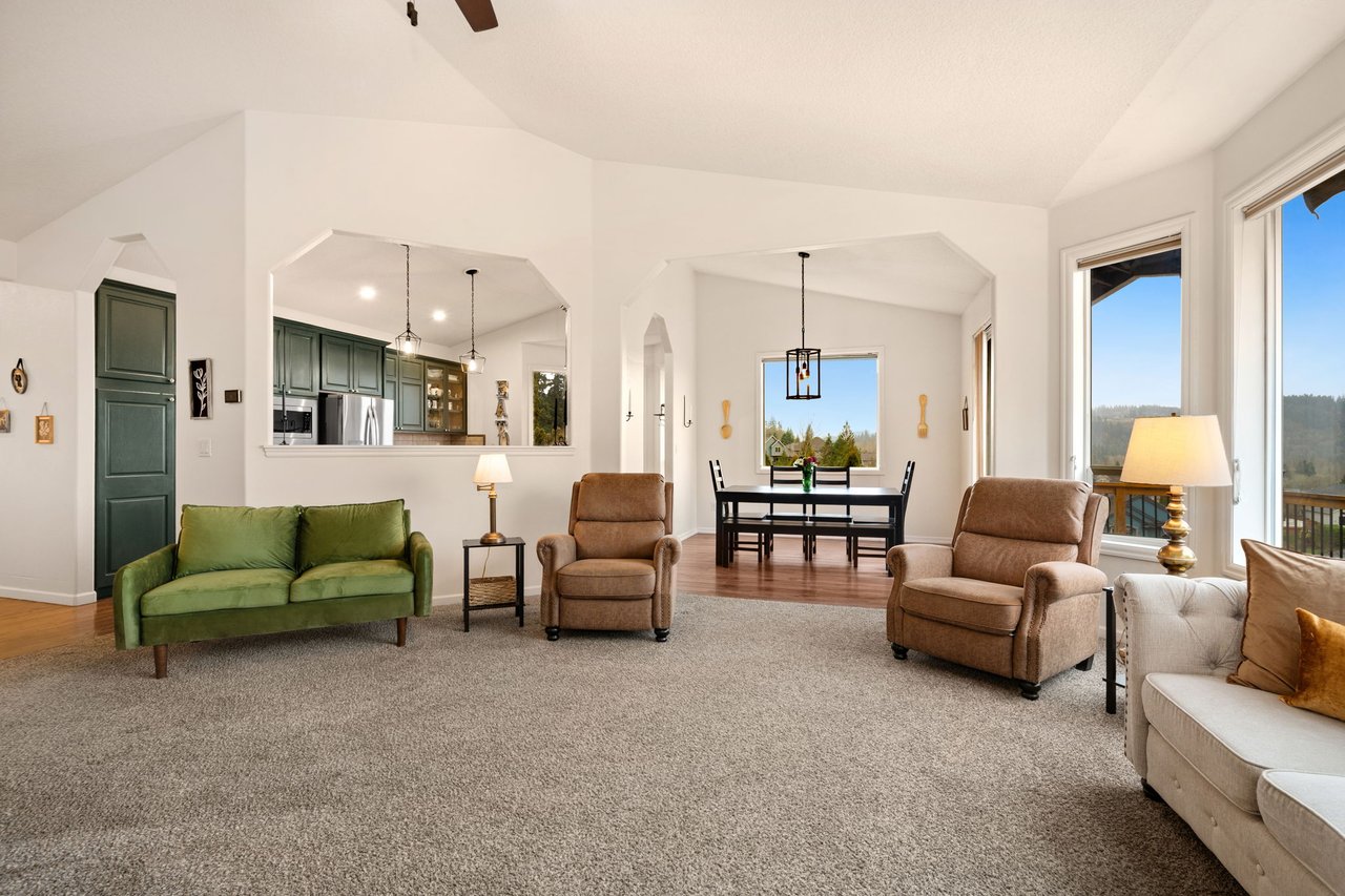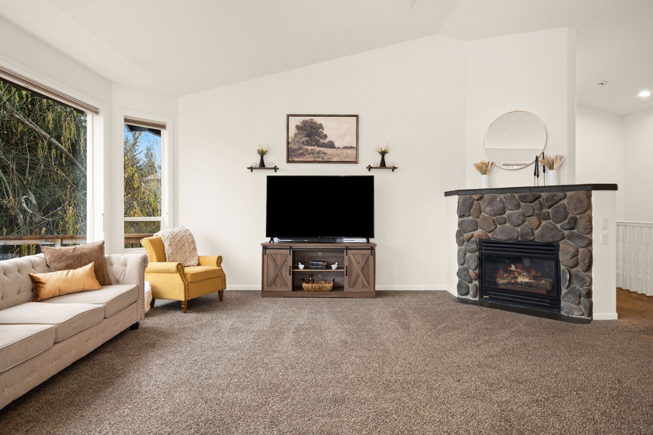 Step inside to discover a vaulted main level that immediately feels bright, open, and welcoming. The living room, anchored by a cozy fireplace, features expansive windows that showcase peaceful territorial views and fill the space with natural light. From here, the eye naturally flows into the dining area and beyond to a deck that runs the span of the home, perfect for morning coffee, summer barbecues, or sunset views.