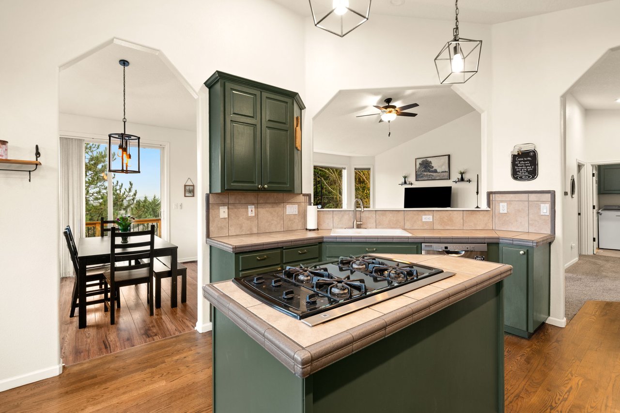 The kitchen is both functional and inviting, with ample counter space, an island with gas cooktop, and easy access to the main living areas. Whether you're hosting gatherings or preparing weekday meals, this space strikes a great balance between everyday practicality and social connection.