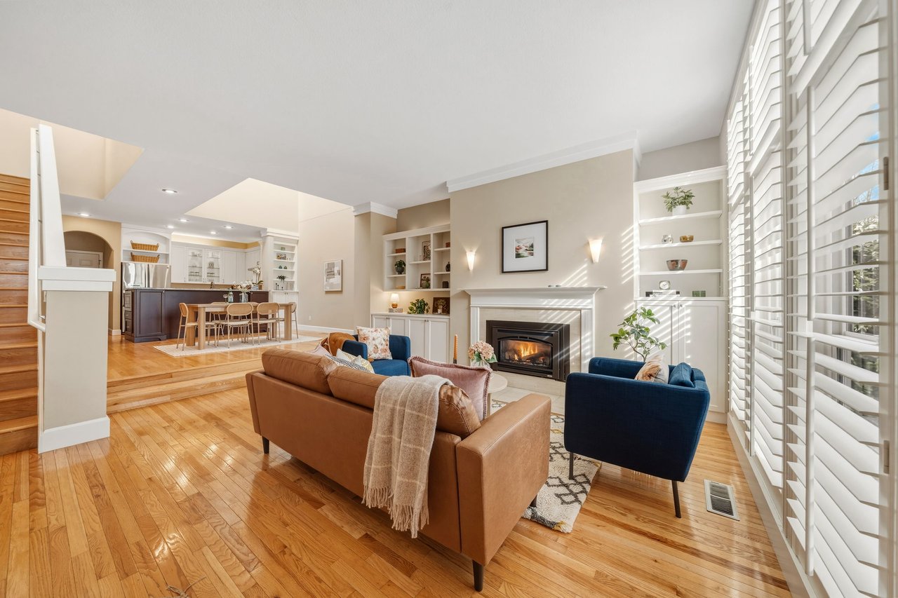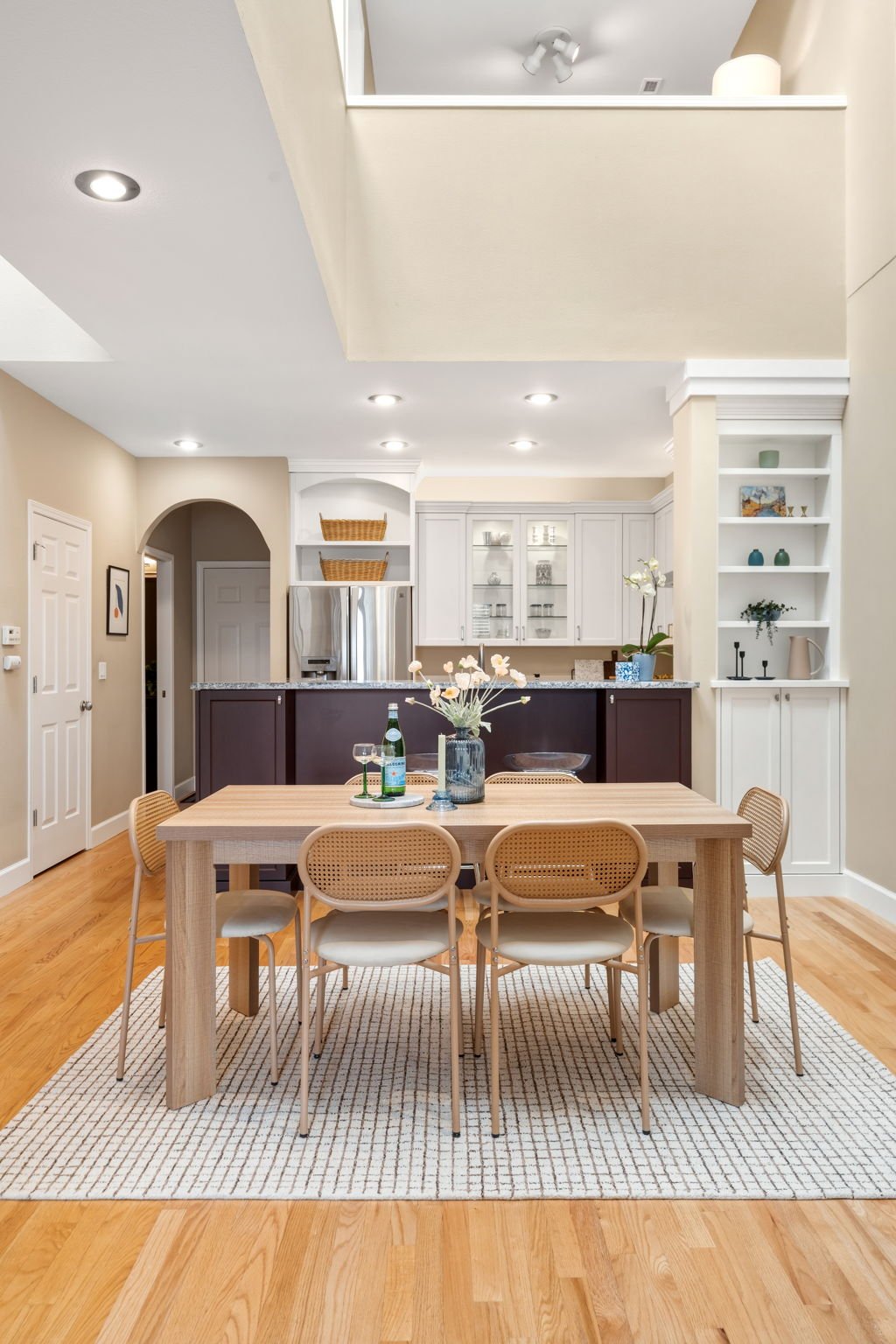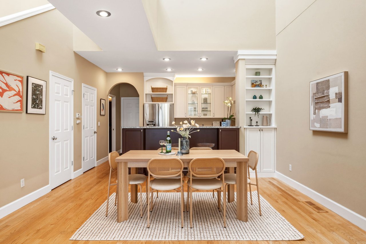 Step inside and you’re immediately greeted by soaring ceilings and an abundance of natural light. The living room opens into a stunning dining area where cathedral ceilings and skylights create an airy architectural focal point that fills the home with sunlight throughout the day.