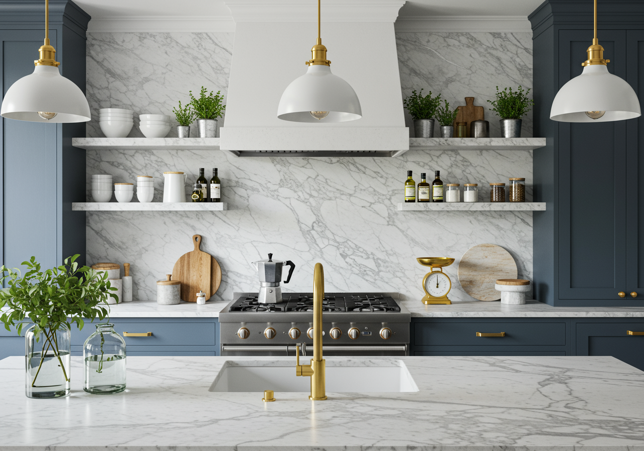 Marble, Venetian plaster, and hardwoods are all go-to choices for high-end homes. And you’ll likely see appliances from companies such as Miele, Viking, and Sub-Zero.